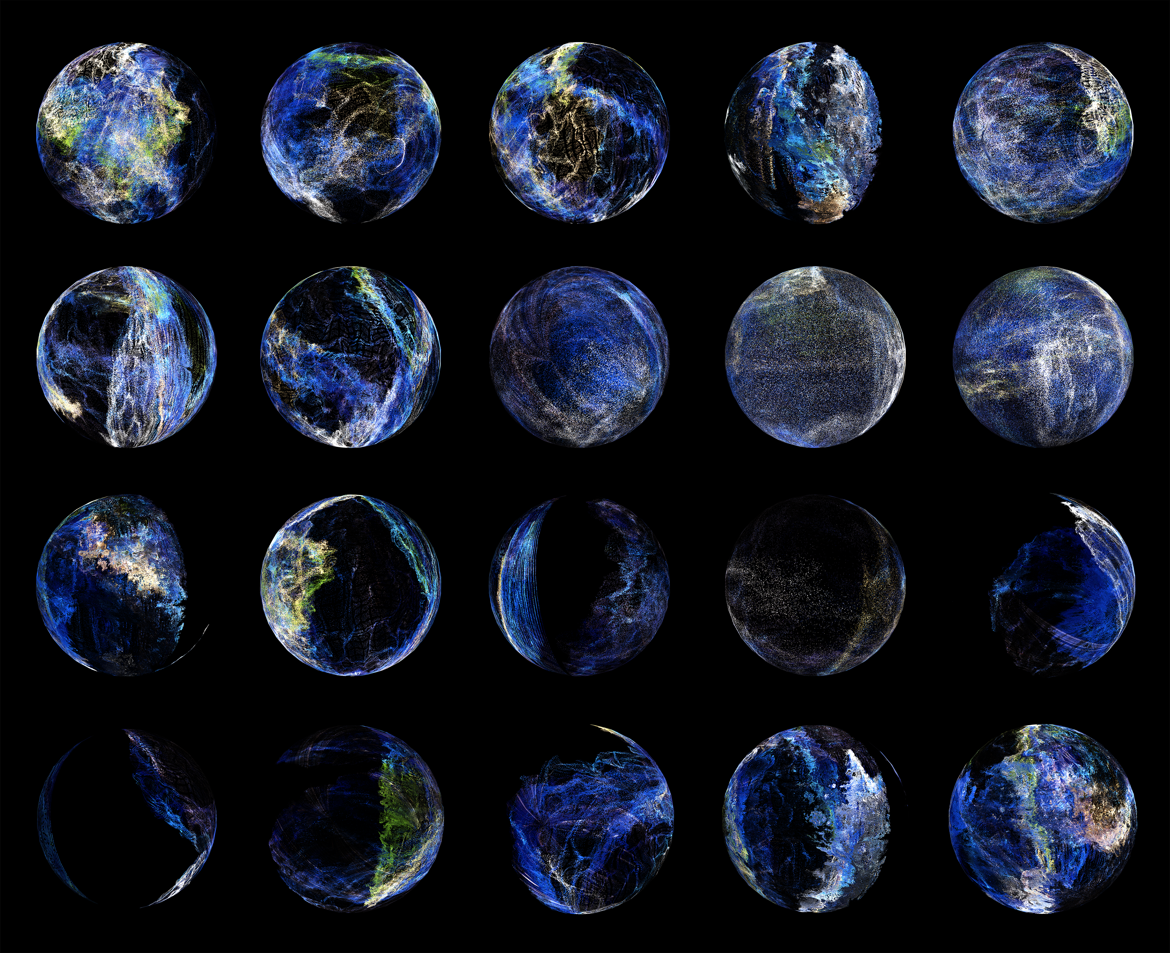 今日人類消耗資源的量相當於1.75個地球。到2030年以前,我們會需要2個地球才能支撐所有人的生存。然而第二個全新的地球並不會憑空出現在外太空,提供給我們另一個完美的生存環境,我們唯一能做的只有真正面對人類對地球環境造成的問題。 Earth Phase 地相圖04.22 即是受2021年世界地球日主題「恢復我們的地球」所啟發,在這件作品中,我為地球祈禱、冥想,並使用即時的腦波資料來生成一個個可以從疾病中自我恢復的動態地球。